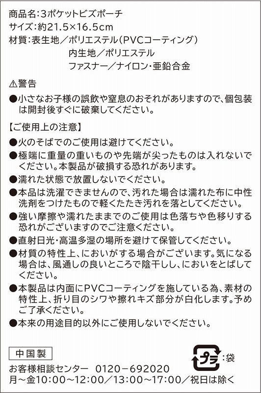 表生地/ポリエステル(PVCコーティング) 内生地/ポリエステル ファスナー/ナイロン・亜鉛合金