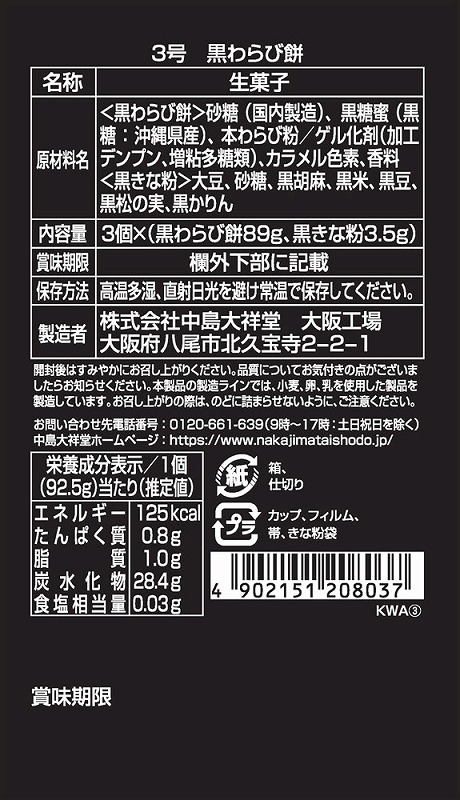 <セット内容> 黒わらび餅89g(黒きな粉3.5g付)×3