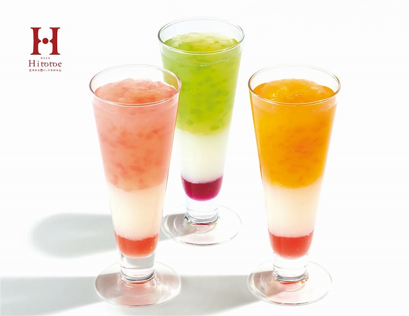 口どけの良いジュレと、もちもちのフルーツわらび餅。爽やかなヨーグルトゼリーを挟んで、最後にとろりとしたフルーツソースをかけました。