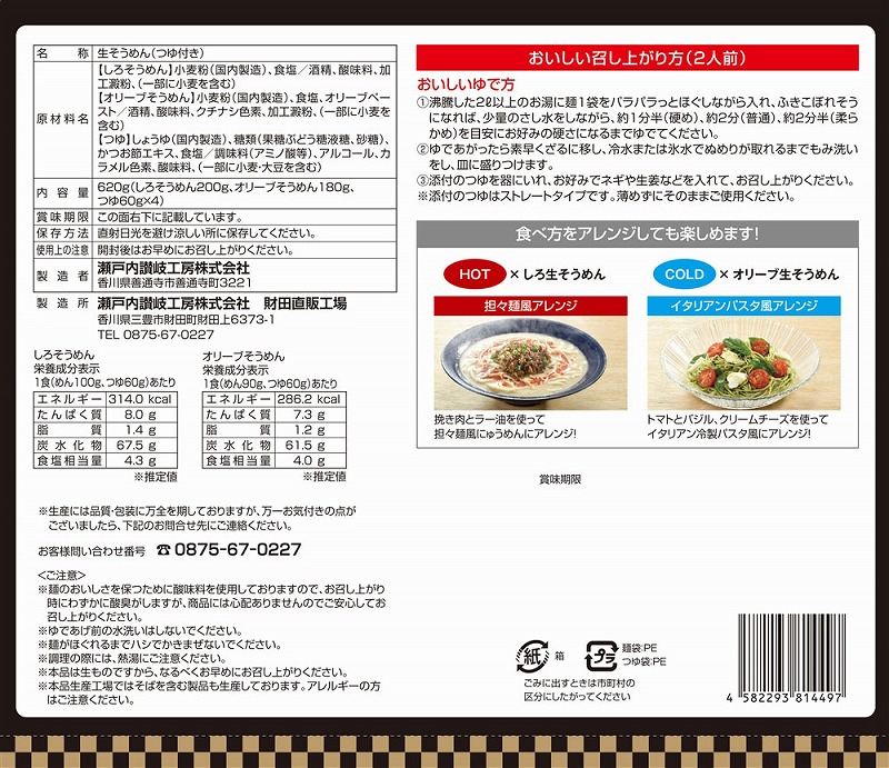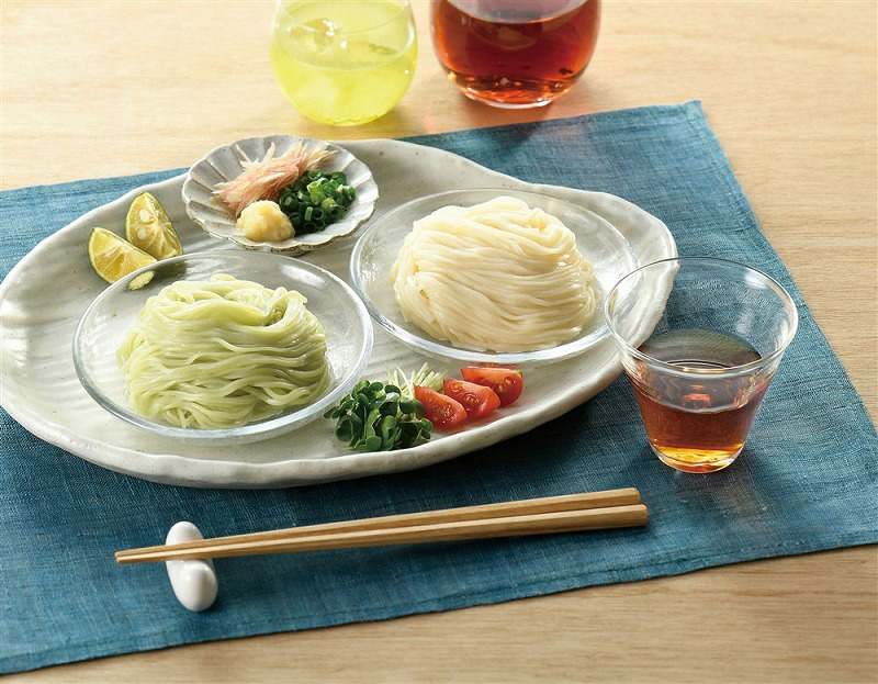 そうめんなのに歯ごたえがある!「打ちたての麺に近い味が楽しめる」と話題の生そうめんを、小麦の味を感じられる「しろ生そうめん」とオリーブの風味を感じる「オリーブ生そうめん」の2つの味でたっぷりお楽しみいただけます。