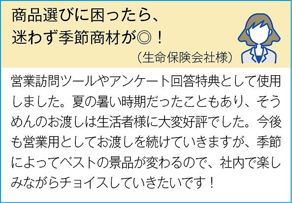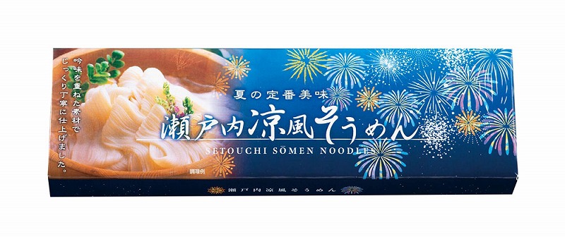 瀬戸内地区は、伝統的な技術によりおいしい素麺がたくさん作られており、このおいしい素麺を箱に詰めました。どうしても食欲が減衰してしまいがちな夏の暑い日にグルメの贈り物として販促品、来場記念品としてご使用いただければお客様に喜ばれます。