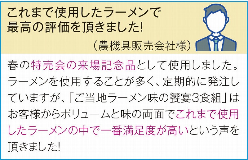 喜多方醤油・札幌味噌・東京塩の3種のご当地ラーメンをお楽しみいただけます。食べ切りサイズで手軽に調理できるので、ご家族や一人暮らしの方にもおすすめです。「思わず手に取り食べてみたくなる」パッケージのインパクトも魅力の1つです。会員特典や購入者特典にぜひご利用ください。