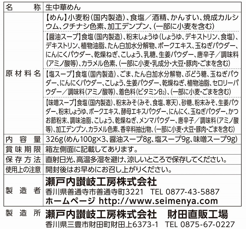 <セット内容> 麺100g×3 醤油スープ8g×1 味噌スープ9g×1 塩スープ9g×1
