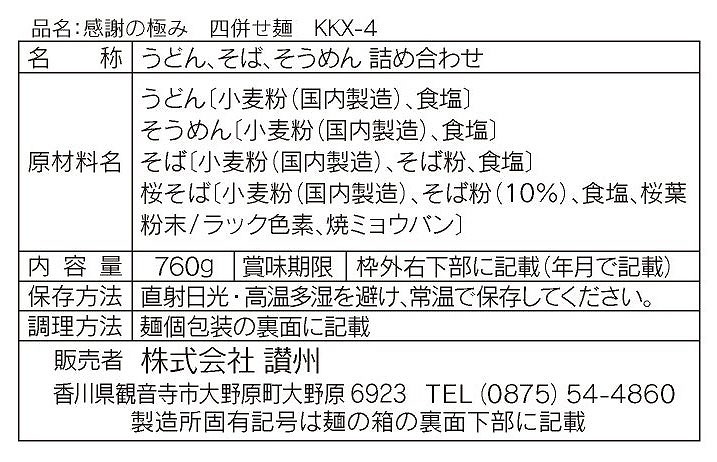 <セット内容> 桜そば180g(2食)×1 そうめん200g(2食)×1 讃岐うどん200g(2食)×1 そば180g(2食)×1