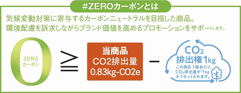 「#ZEROカーボン」とは、CFP(カーボンフットプリント)により算定した商品1個当りのCO2排出量0.83kg-CO2eに対してCO2排出権1kgを使いオフセット(打ち消し)し、CO2排出量実質ゼロ、つまりゼロカーボンに繋がる考え方です。化粧箱に「#ZEROカーボン」の仕組みがわかるQRコード付。名刺が差せるスリット入りパッケージ仕様。