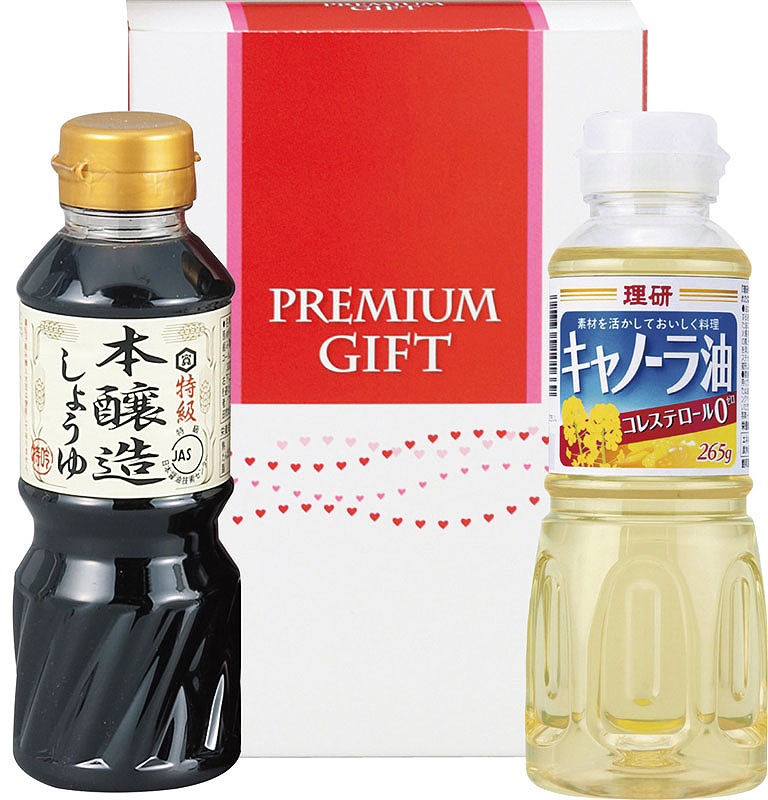 オレイン酸たっぷりのキャノーラ油と、特級本醸造醤油の貰って嬉しいセットです。