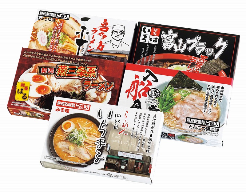 <セット内容> 札幌「いちまる」味噌味・喜多方「一平」醤油味・新潟燕三条系「はる」醤油味・富山ブラック「麺屋いろは」醤油味・博多「入船食堂」とんこつ味各2食(計10食)(麺70g・スープ付)