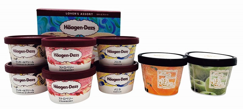 <セット内容> ハーゲンダッツラバースアソート(バニラ・ストロベリー・クッキー&クリーム)各70ml×各2、フルーツティアラソルベ(青リンゴ・ミカン)各108ml×各1