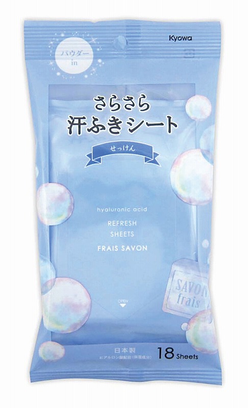 お肌のベタつきをしっかり拭き取り、ニオイもスッキリ。ヒアルロン酸(保湿成分)配合。