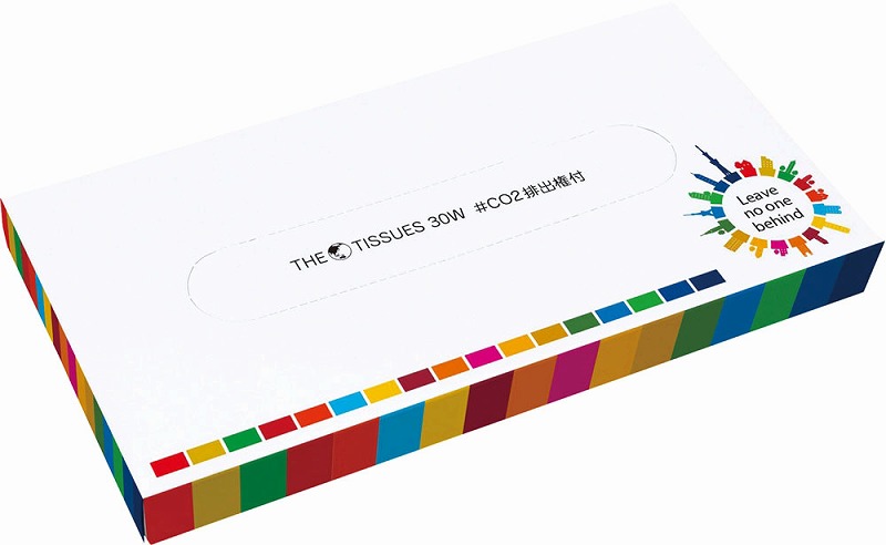 SDGsのゴールをイメージしたボックスティッシュ。積み上げればカラフルで目を惹く店頭POPになります。二酸化炭素の削減に間接的に貢献できます。