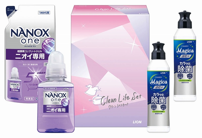 人気のナノックスの本体と詰め替え用、マジカ本体2本をおしゃれな化粧箱にセットした販促非売品の日用品ギフトセット。