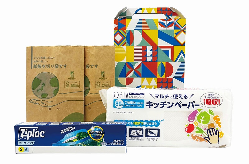 <セット内容> ・ソフトパックキッチンペーパー80W×1 ・ジップロックフリーザーバッグS3枚×1 ・地球にやさしい紙製水切り袋×2