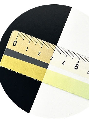 白いものの上では通常の透明定規ですが、黒など濃い色の上に置くとメモリ部分に色が付き数字やメモリを読む事ができる特殊インクを使用した15cm定規です。