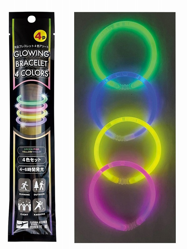 軽く曲げると内容液が混ざり化学発光するブレスレット。ピンク、イエロー、グリーン、パープルが各1本、計4本と専用アタッチメント4個がセットされています。電池不使用。発光時間は約4~6時間。