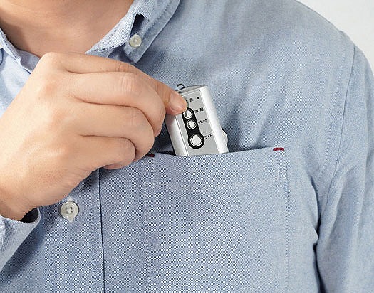 両耳イヤホン付き。ちょっと明かりがほしい時にパッと役立つLEDライト付き!ウラ面のクリップで胸ポケットやズボンのポケットに留めておくこともできます。