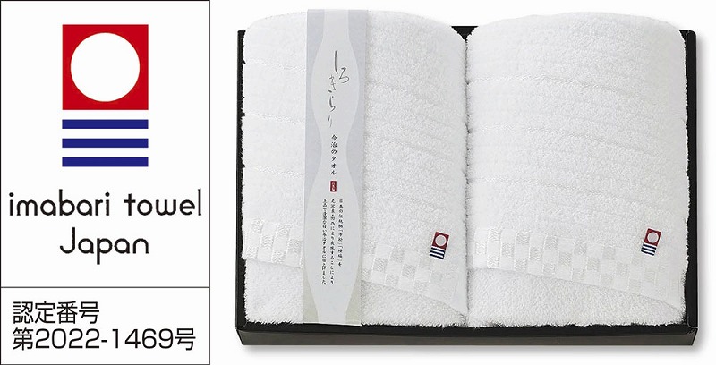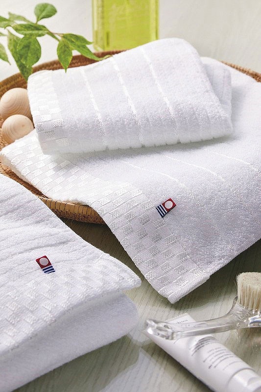 日本の伝統柄「市松」と「横縞」を、光沢糸とジャカード織の凹凸により美しく表現しました。 今治ブランド認定番号:第2022-1469号