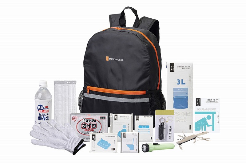 <セット内容> エマージェンシーリュック×1 蓄光LEDライト×1 水に流せるポケットティッシュ(10W)×1 静音アルミブランケット(約213×137cm)×1 非常用給水バッグ(3L)×1 携帯トイレ(凝固剤付き)×1 非常用呼子笛×1 使い捨てマスク×1 絆創膏・綿棒セット×1 保存水×1 軍手×1 防災ガイドメモ×1 使い捨てカイロ×1 八徳ナイフ×1
