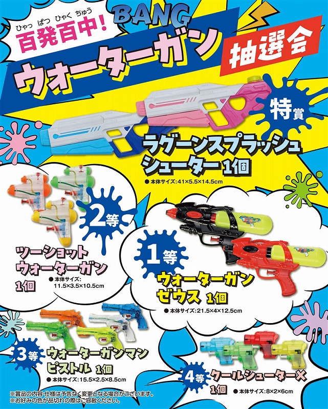 <キット内容> [特賞]ラグーンスプラッシュシューター・・・1本 [1等]ウォーターガンゼウス・・・2本 [2等]ツーショットウォーターガン・・・3本 [3等]ウォーターガンマンピストル・・・4本 [4等]クールシューターX・・・20本 <付属品> 抽選くじ×30、抽選箱×1、くじ明細書×1、告知用A3ポスター×1 ※賞品の内容・仕様は画像と異なる場合があります。あらかじめご了承ください。