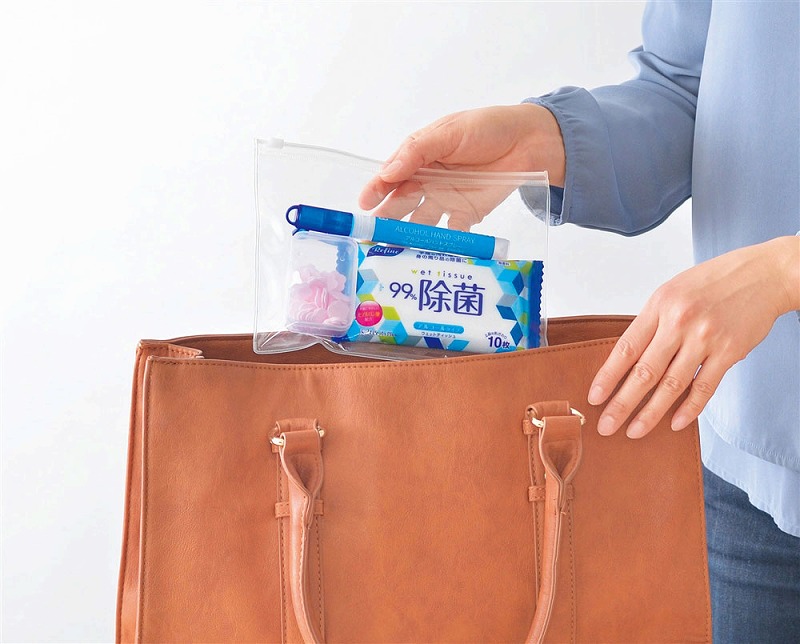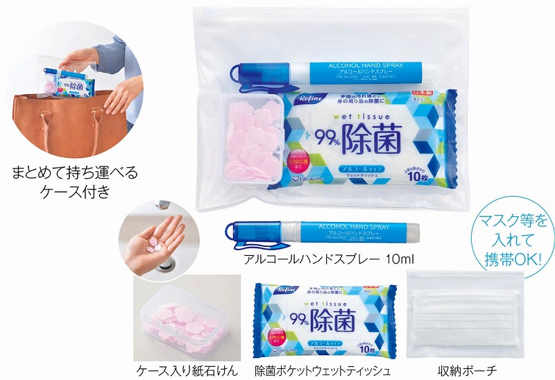 [旧来ご提供単価179円] 衛生対策必須のアイテムがまとめられたセット。専用収納ポーチにはマスクも収納可能です。