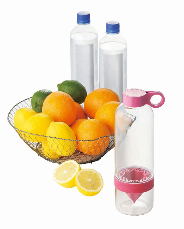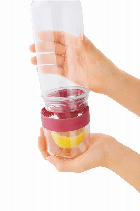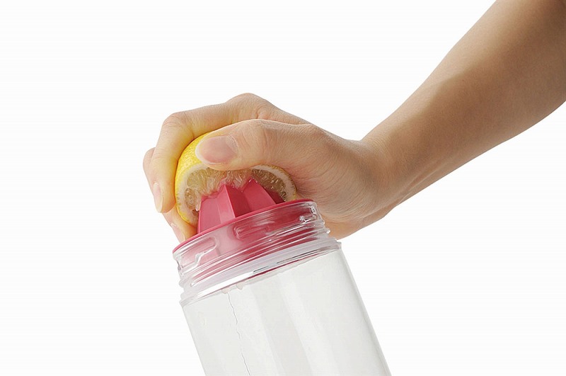 下部のスクイーザーで柑橘類などのフルーツをぎゅぎゅっとしぼると、そのままボトル本体に生しぼりジュースが落ちる構造。キャップ部分を外すとそのまま飲み口にもなるので酵素たっぷりのヘルシージュースが手軽に摂れます♪