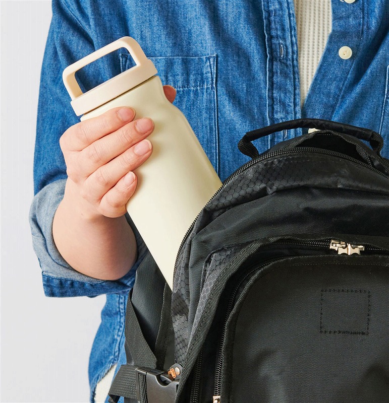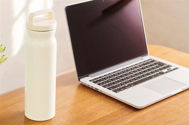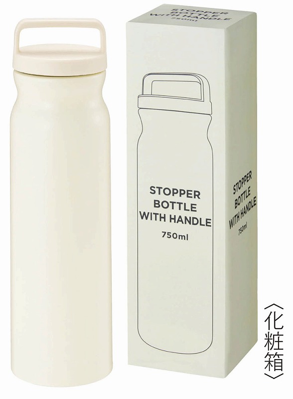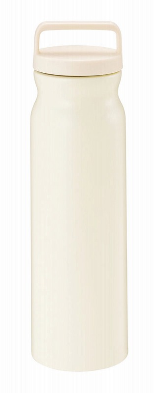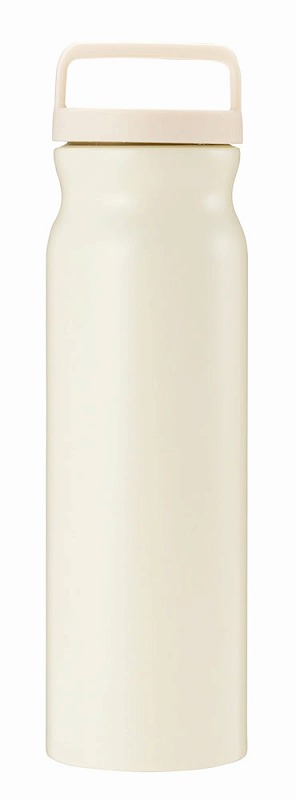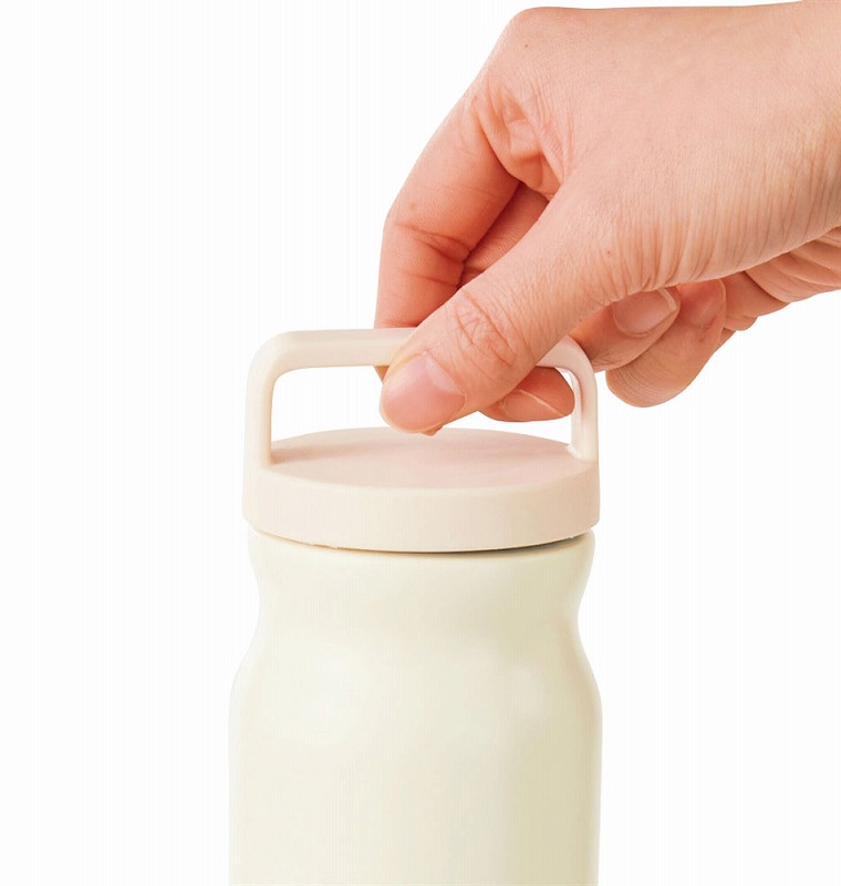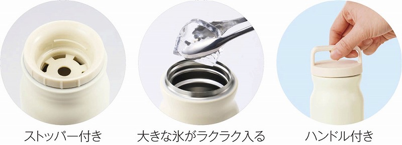 フタにハンドルが付いた真空二重構造のステンレスボトル。持ち運びやすく、氷が入る広口設計で飲み口部分はストッパー付きで便利。名入れも可能で、アウトドア・スポーツ・お出かけに最適!コーポレートカラーの名入れが映えるホワイトボディが特徴です。