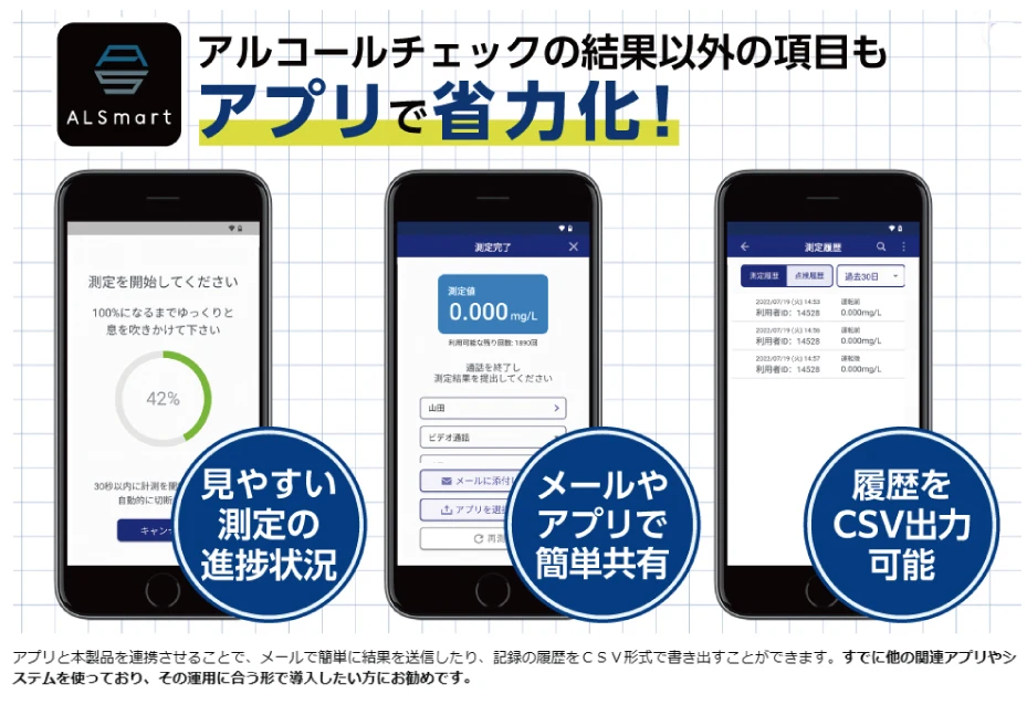 Bluetooth®機能付きで専用アプリ「ALSmart」に対応。誰でも簡単チェック&結果データの保管が可能です。測定結果はスマートフォンの専用アプリに連動して表示され、メールやチャットアプリで簡単に送信できます。製品本体の個体識別番号もALSmartアプリに送信。使用期限がわかるアラート機能や前回使用した機器と違う機器に接続した場合のアラート機能も。複数人が近くで同時に使用した場合などにおける誤接続を防止します。