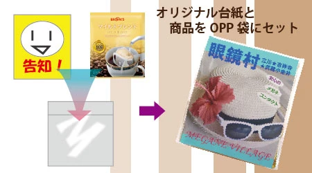 【オリジナル台紙セット】:オリジナルパッケージ コーヒーと、広告などに便利なオリジナル台紙をセットにして、opp袋に入れる