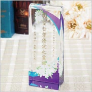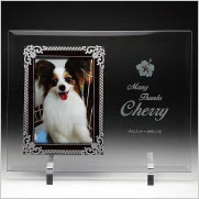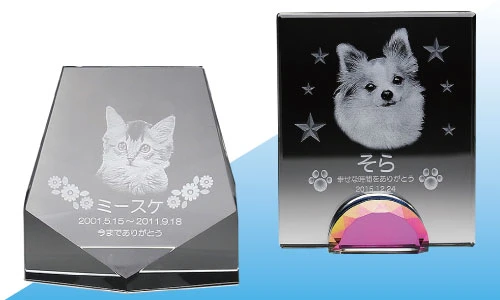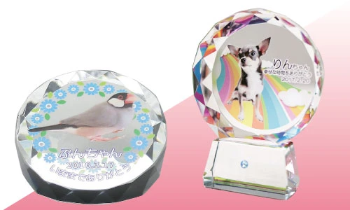 美しいクリスタルのお位牌に、2Dレーザー彫刻、またはUVカラー印刷で、大好きなペットの姿を残せます。