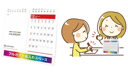 従来のカレンダーへの名入れ印刷は「単色」又は「箔押し」が主でした。 フルカラーのロゴの会社・お店向きのカレンダーをご用意しております。 キャラクターなどをお持ちでしたら、そのイラストなども印刷できます!