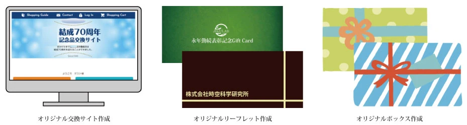 業績表彰、勤続表彰などの社内表彰の記念品、周年記念や創立記念などの社外への配布を含む記念品として。
