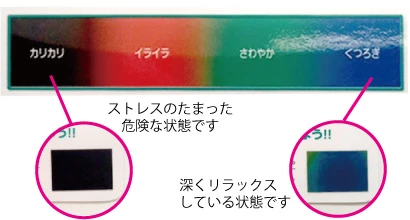 チェック部分(カード右下)に10秒指を当てて、4段階の色変化でストレス状態をチェックします。ストレスは健康・美容・仕事効率の大敵です!
