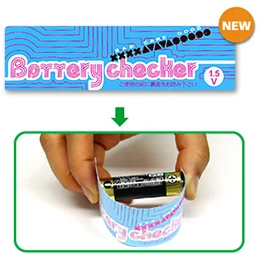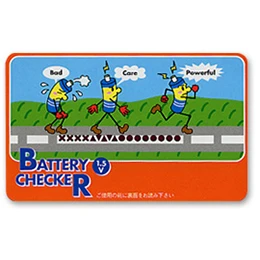カードの両端をプラス・マイナス極に接触させると乾電池の残量がゲージで一目でわかるバッテリーチェッカー。