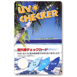 カード左下円部分を日光に当てると、3段階の色変化で紫外線強度をお知らせ。