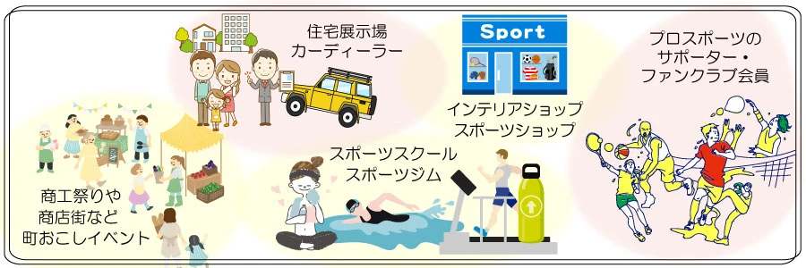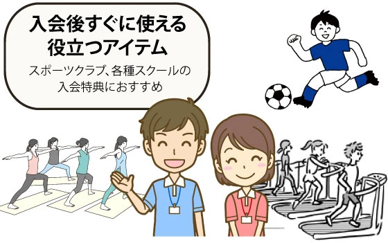 スポーツ施設やスポーツ競技運営者、カーディーラー、展示場などで入会特典や景品、プレゼント、ノベルティ、オリジナル物販として幅広くご利用いただいております。