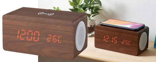 多機能スピーカー。ワイヤレス充電、時計、アラーム、温度計など。時計表示下に名入れ可能。
