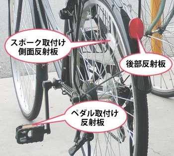 反射板 取付け場所 反射・仕様 側面反射板 自転車後輪スポーク 車輪と同時に回転し、側面に反射 ウィング式リフレクター 車輪と同時に回転し、進行方向前後に反射 -